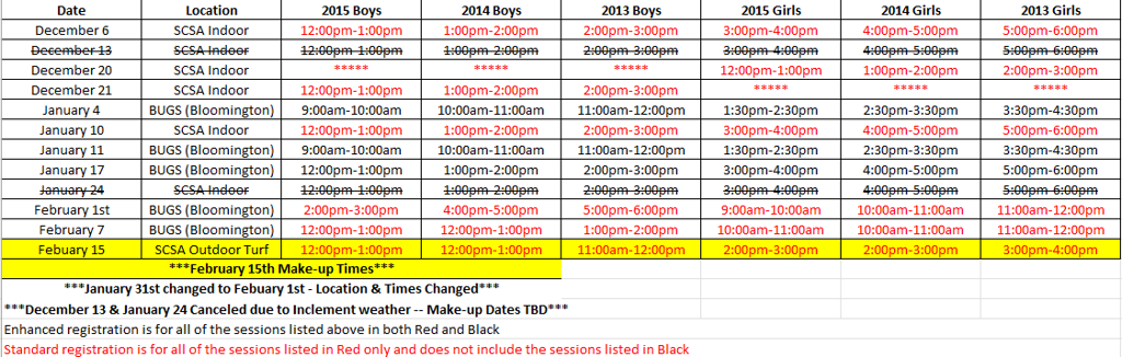 Good morning! Looks like the weather is going to cooperate this weekend so we can make up a session that was canceled earlier this year due to poor weather. This session is for BOTH Standard and Enhanced participants. The session will be held on Sunday, February 15th at the SCSA Outdoor Turf. Please have the player dress accordingly for an outdoor session. We do not have the full details as yet, but wanted to share the session times. Please read carefully as they are different than last weekend.